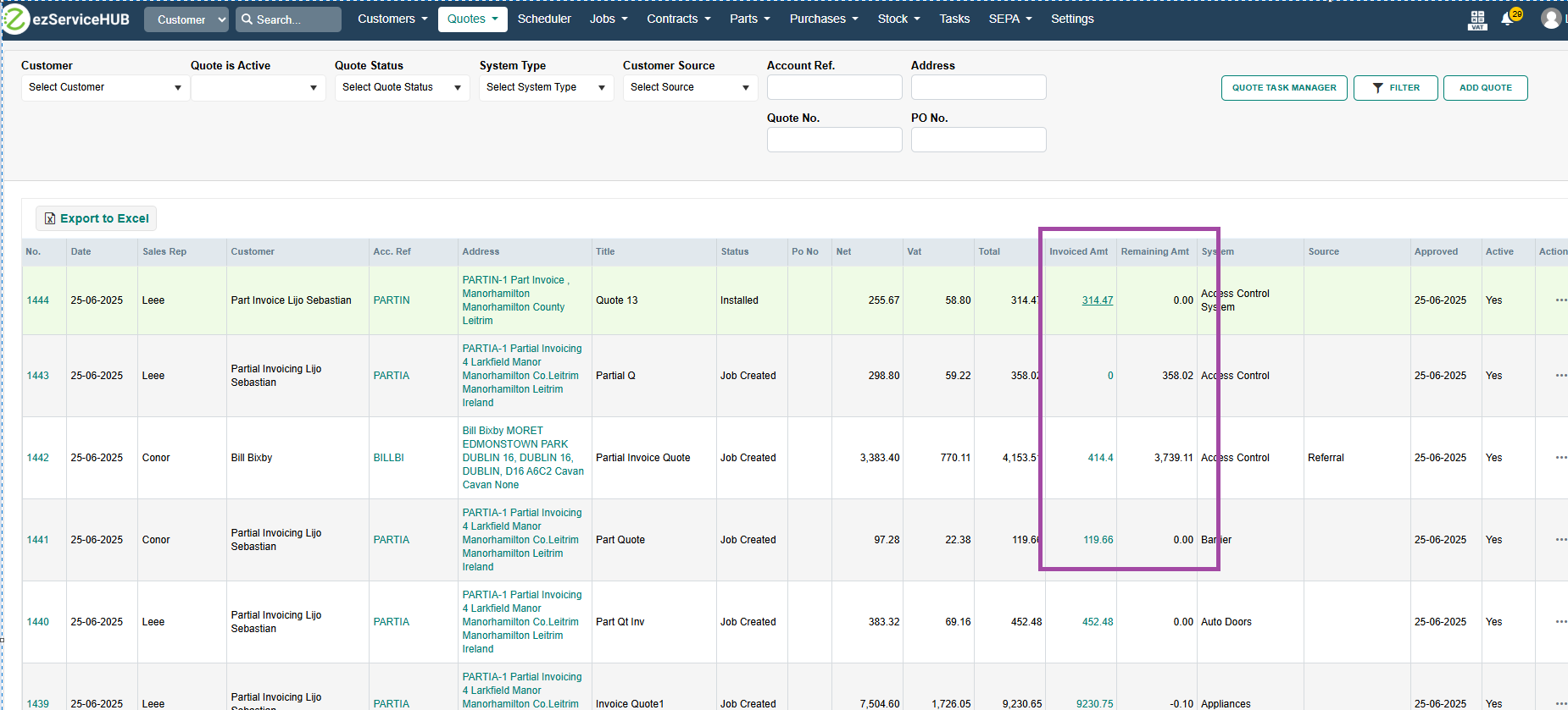 The Quote List screen now includes two new columns: Invoiced Amount and Remaining Amount. Clicking on the Invoiced Amount will redirect you to the Job Cost Analysis Report, filtered to display the specific job or project.