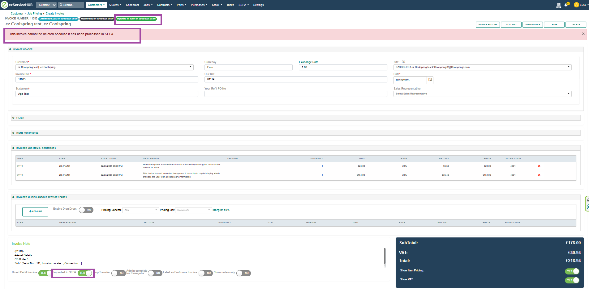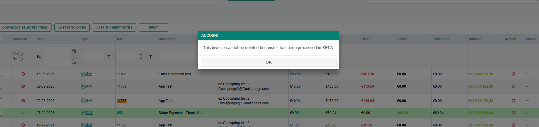If an invoice is imported to SEPA and processed for payments, it cannot be deleted. A ‘Cannot delete’ message will be displayed.