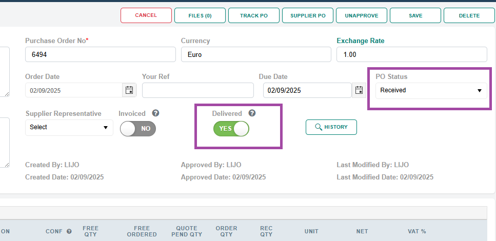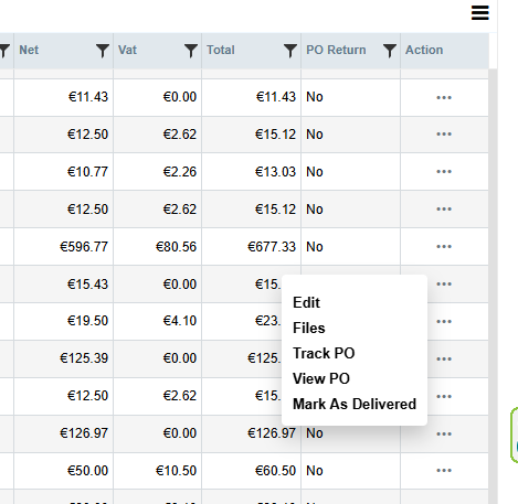 In the Purchase Order list, an option to “Mark as Delivered” has been added. This option will be visible only for approved and not-yet-delivered purchase orders. When marking as delivered, if the purchase order contains no Parts but only Misc Parts, Service, or Carriage items, it will be marked as Delivered. If it contains any Parts, the Goods Return screen will open.