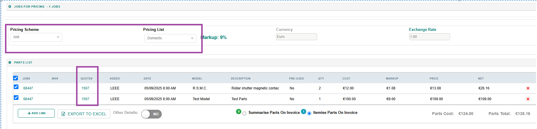 Pricing schema and Pricing List dropdowns will be disabled for Quotes jobs