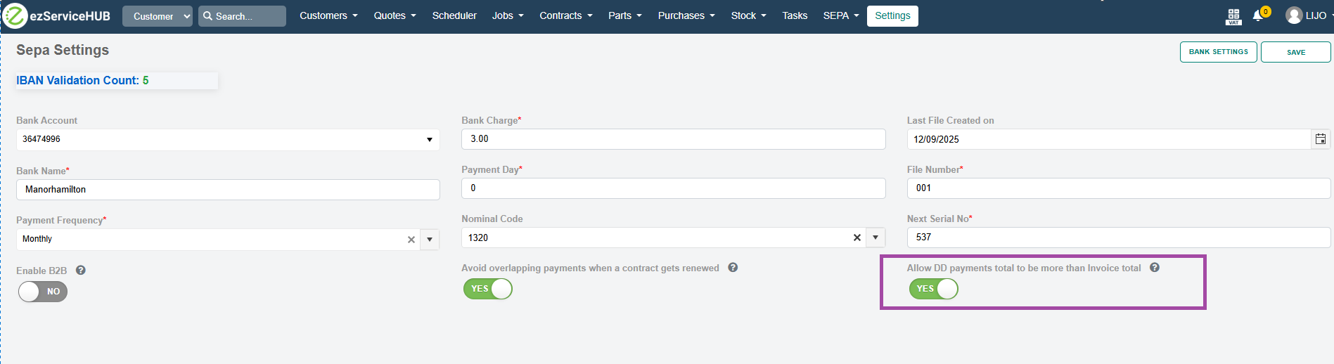 Sepa setting added to Allow/Not Allow DD payments total to be more than Invoice total