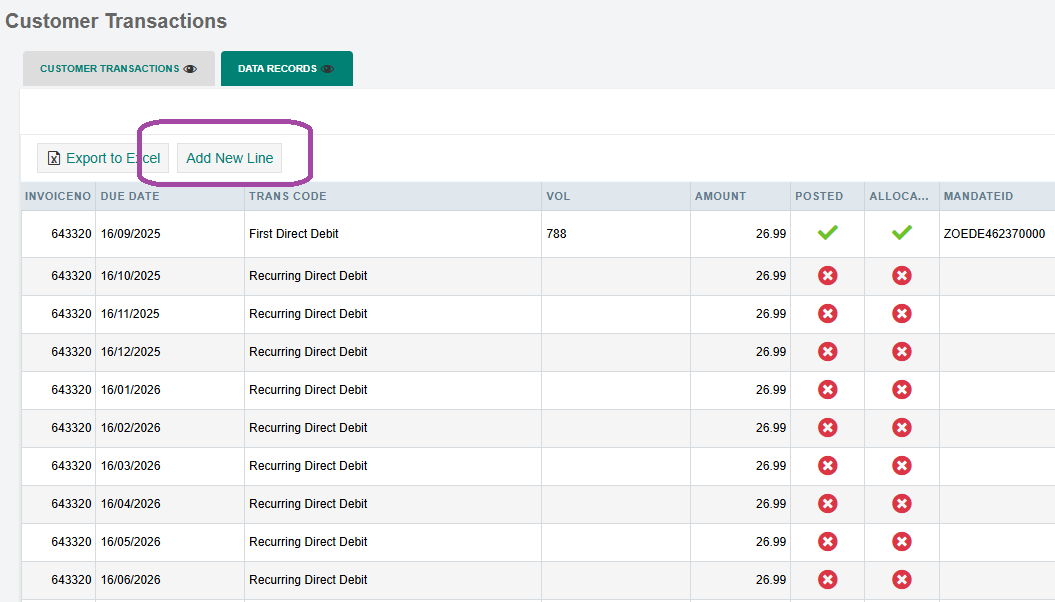 In the Sepa Customer Transactions added the button to Add New Line to collect payments